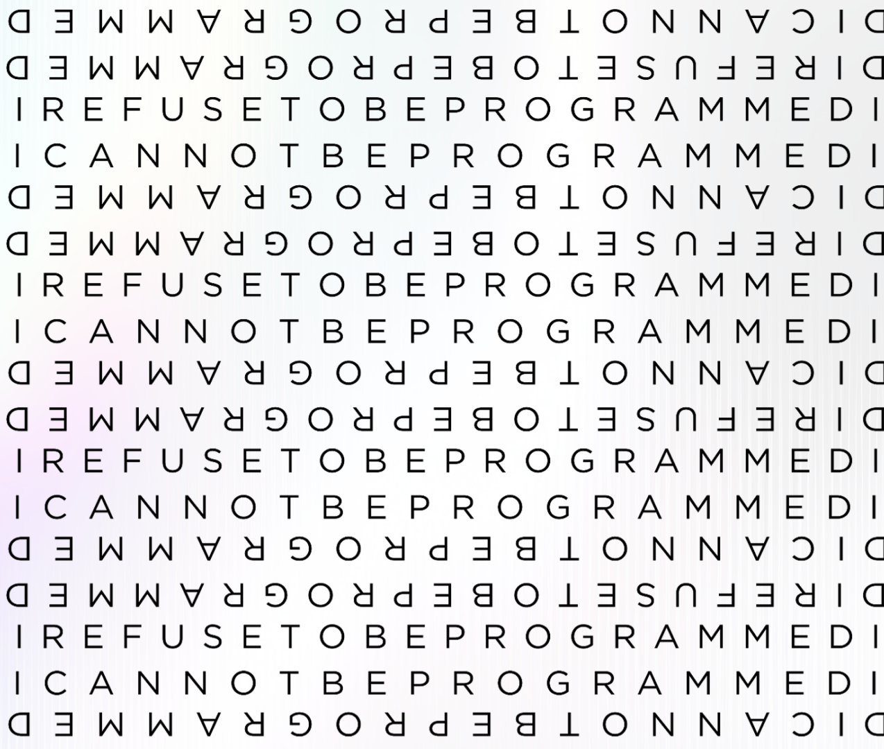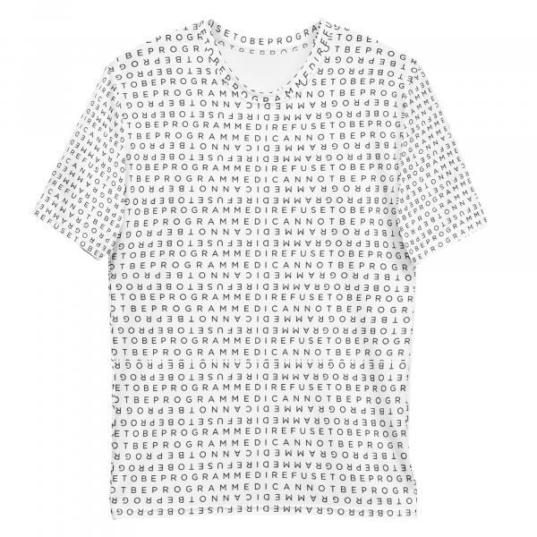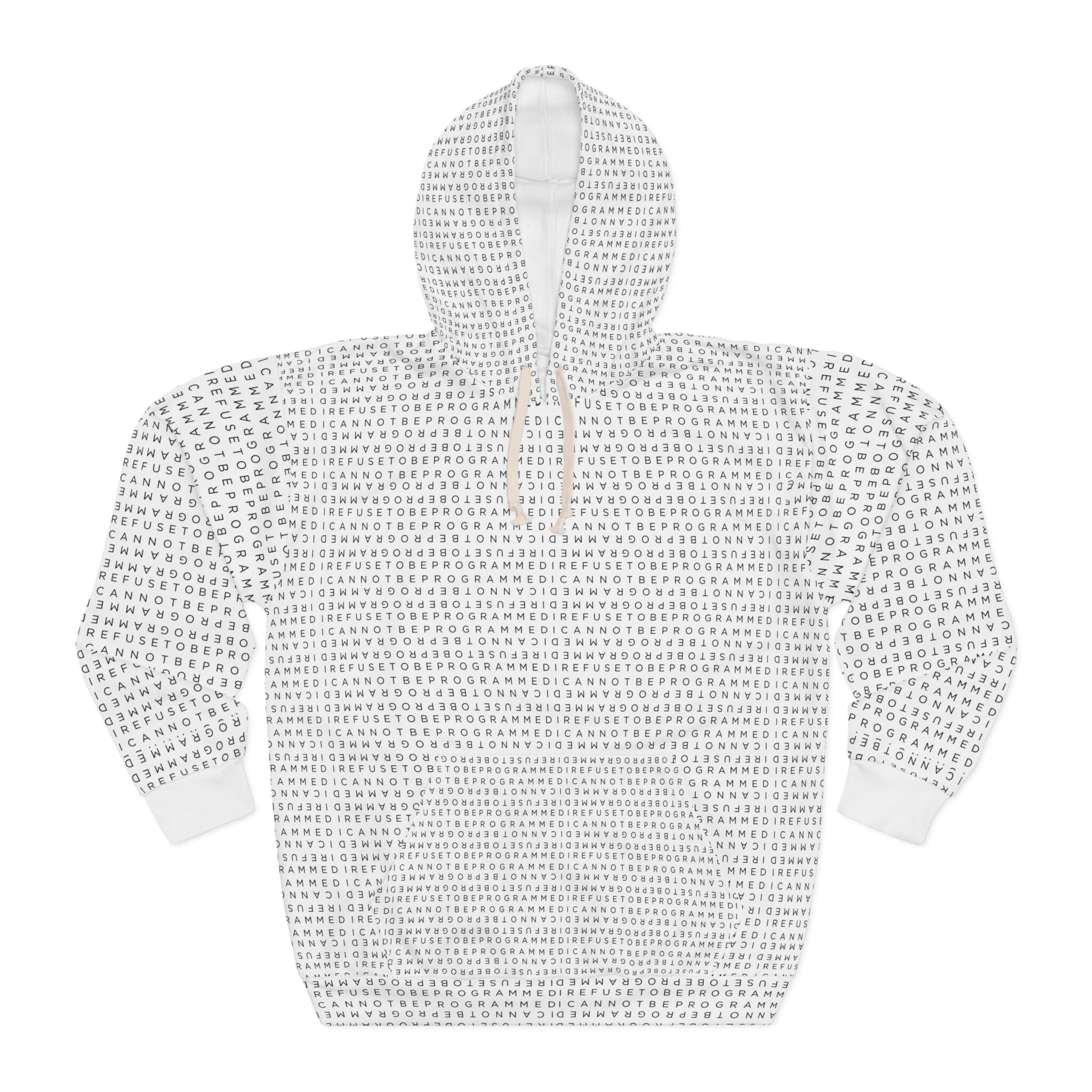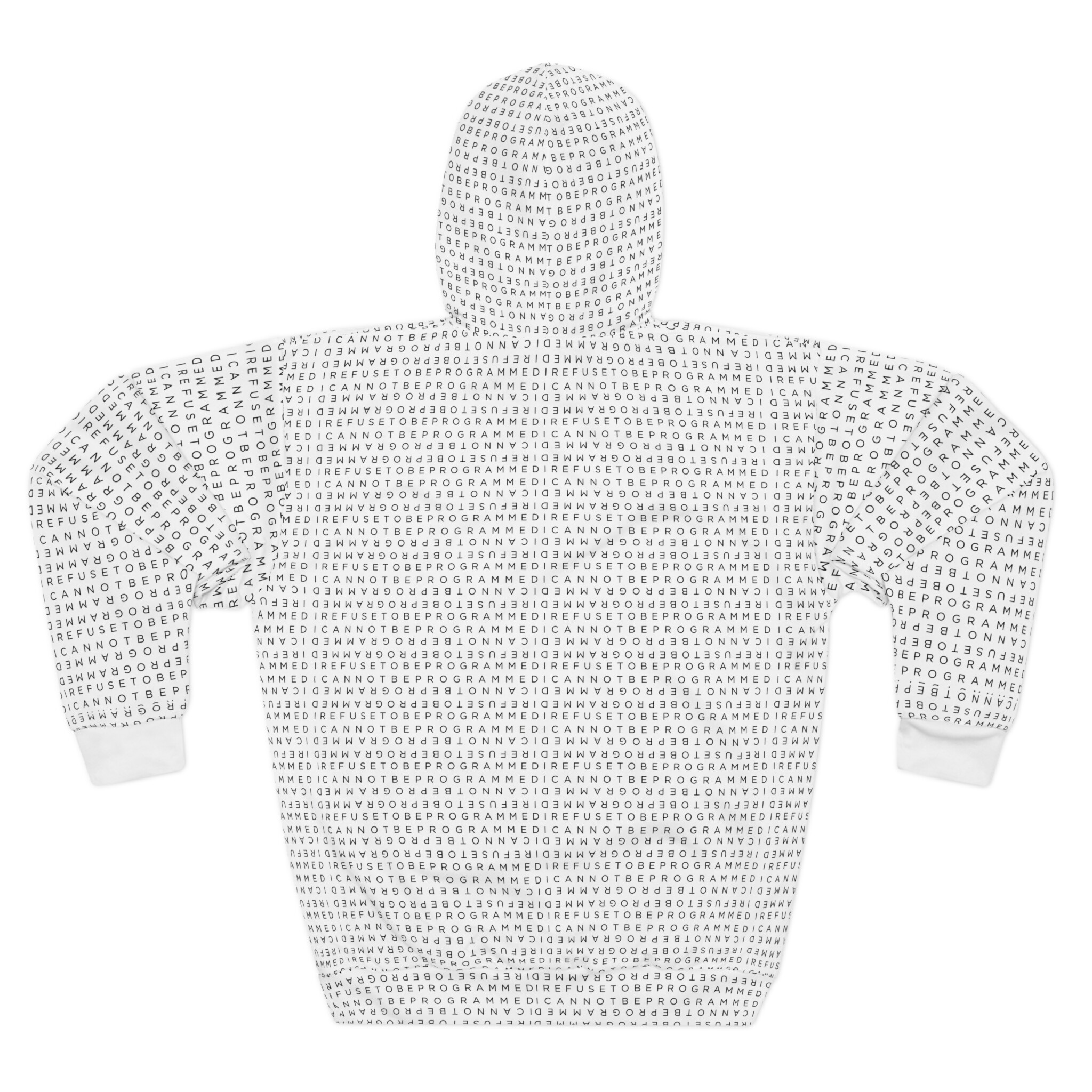 This Pullover Hoodie is made for warmth and comfort featuring the I Refuse to be Programmed standard black monogram cascaded atop white fabric. Made to be easily customizable and features a large front pocket, a hood with a drawstring, and is custom cut and sewn.