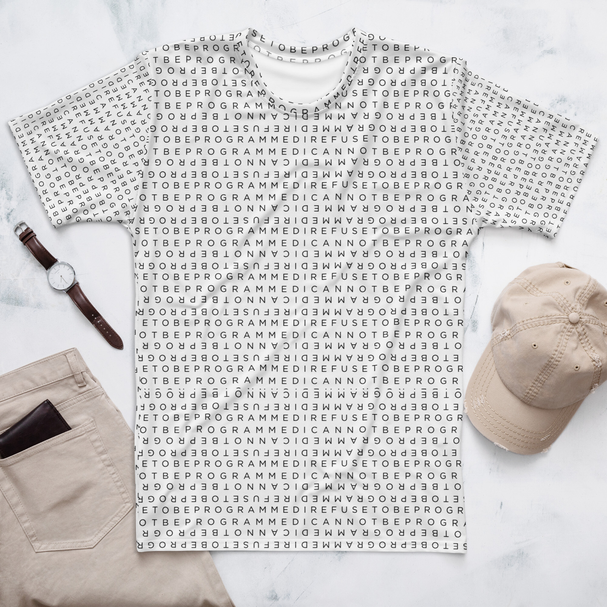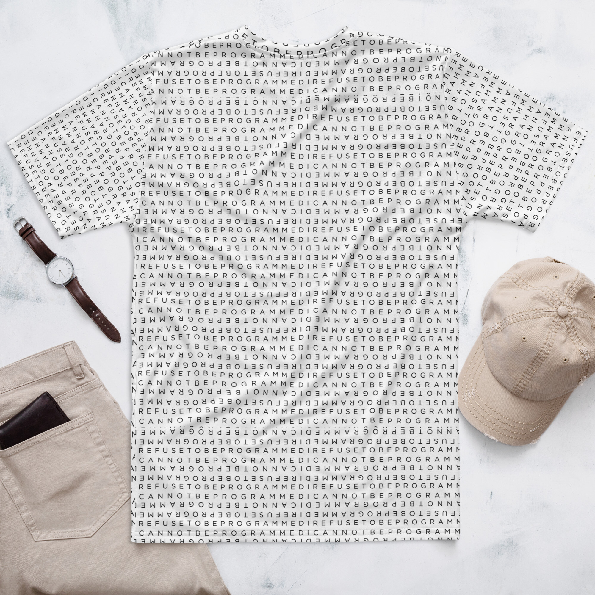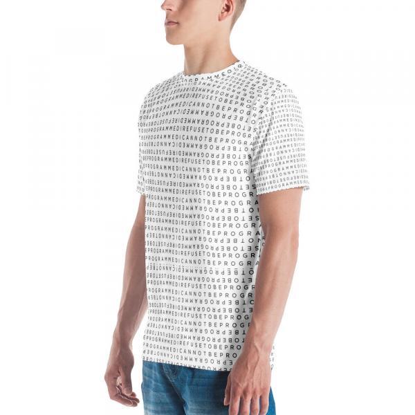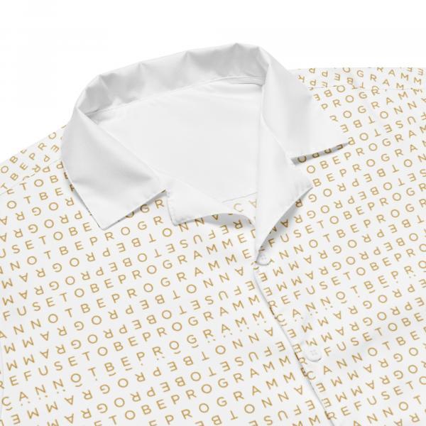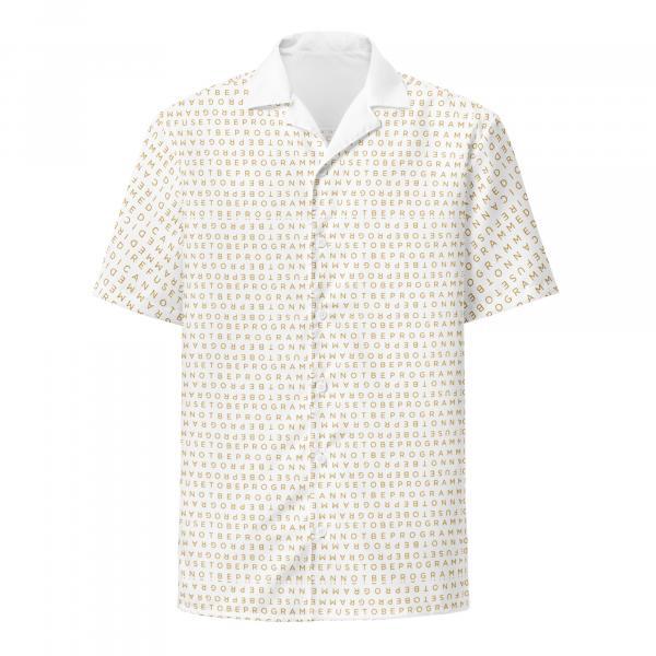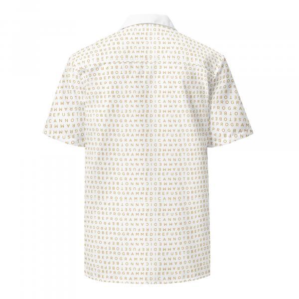 Upgrade the fit with this I Refuse to be Programmed black monogram standard short sleeve shirt. Featuring the original standard black IR2BP jacquard monogram that has “I Refuse to be Programmed” and “I Cannot be Programmed” in a reverse jacquard pattern atop white polyester. Provides a standard regular fit and has a smooth, comfortable 2-way stretch fabric that stretches and recovers on the cross and lengthwise grains.
