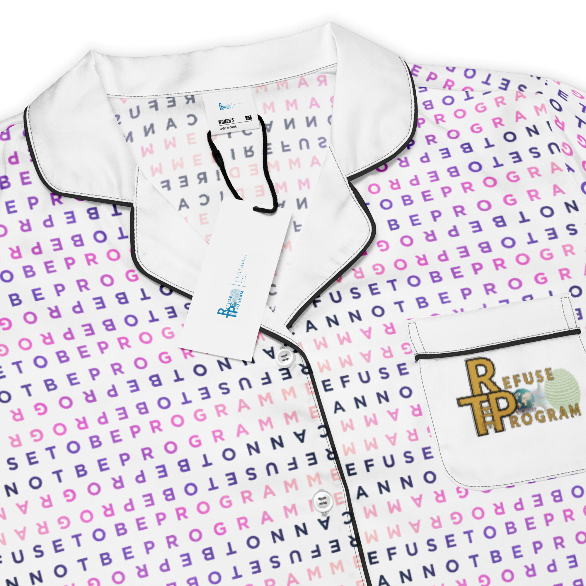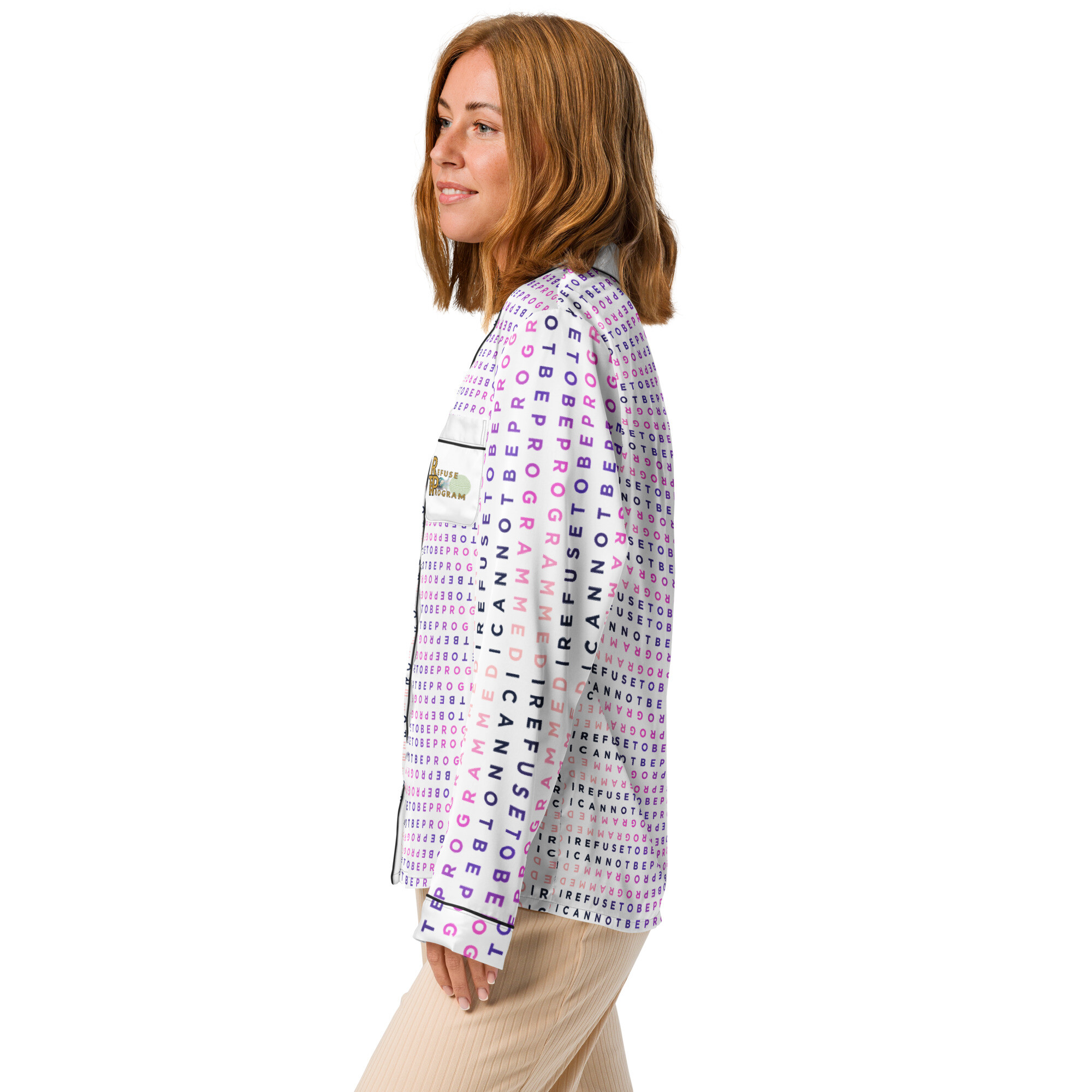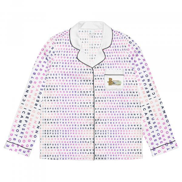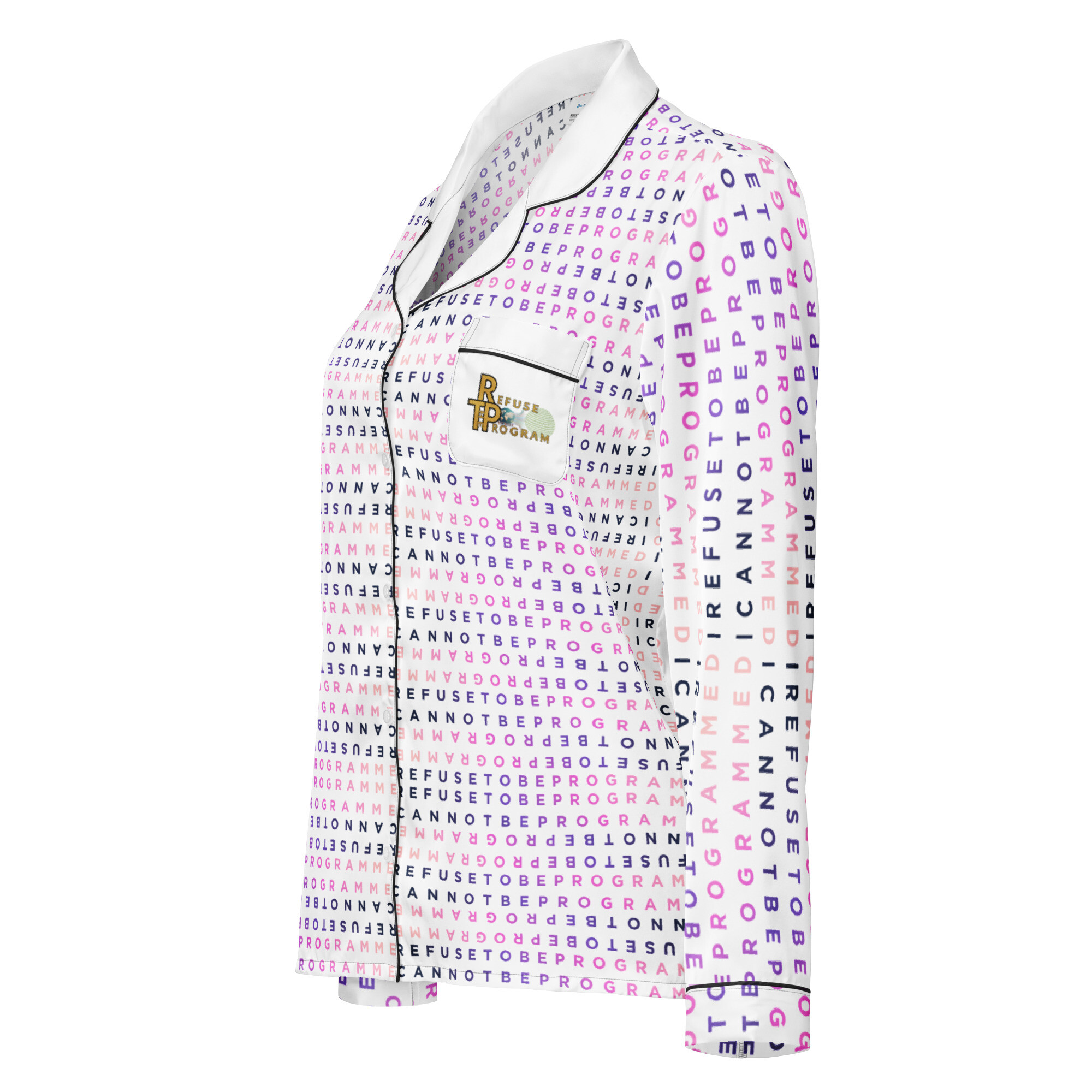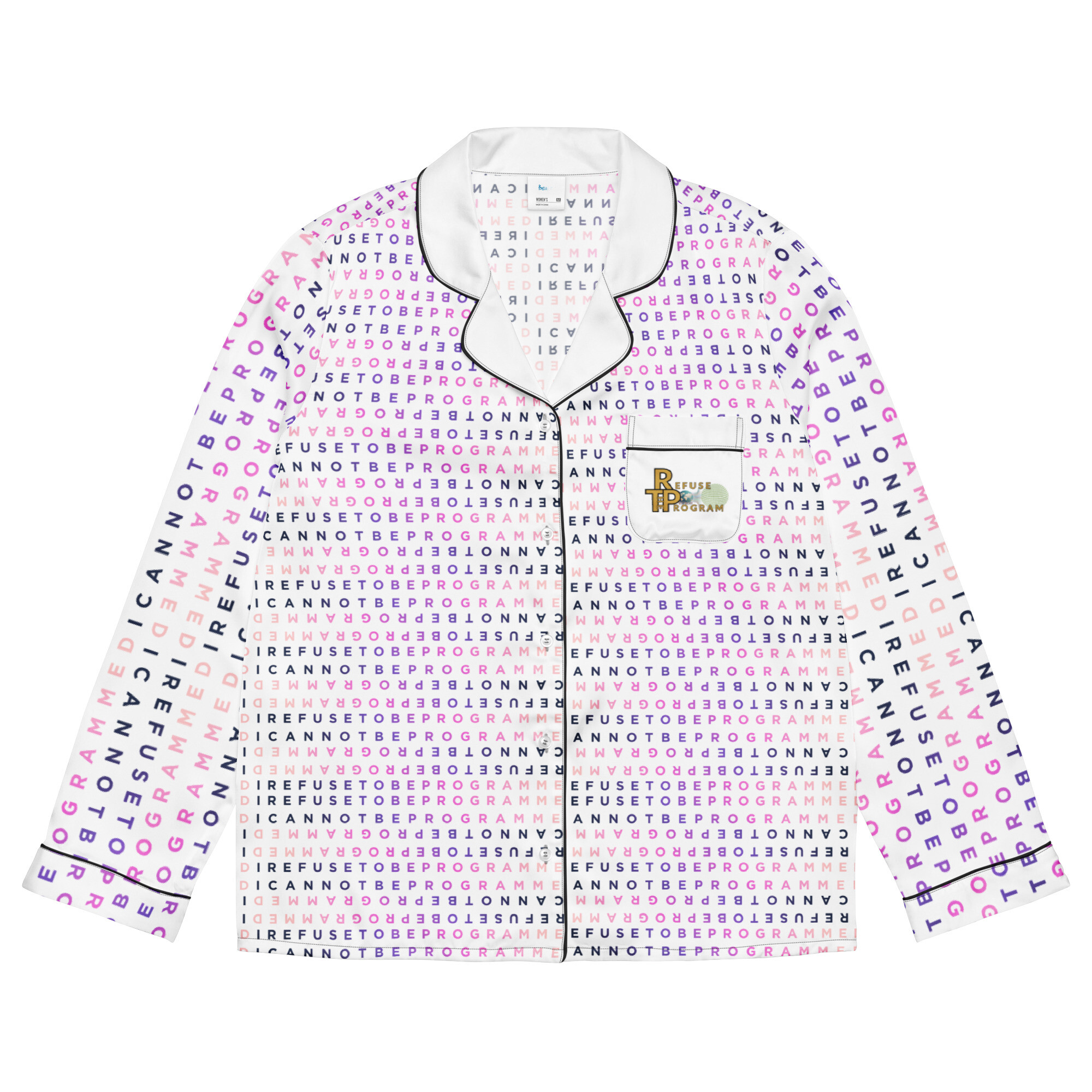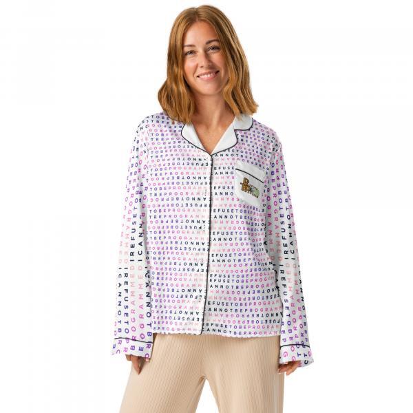 This silky pajama top is ideal for a cozy day when you want to feel both comfortable and elegant. It features the I Refuse to be Programmed signature BlackPink monogram style in jacquard pattern with the Refuse the Program logo on the pocket. This comfortable long sleeve pajama top offers a relaxed fit, chest pocket, and elegant piping detail.