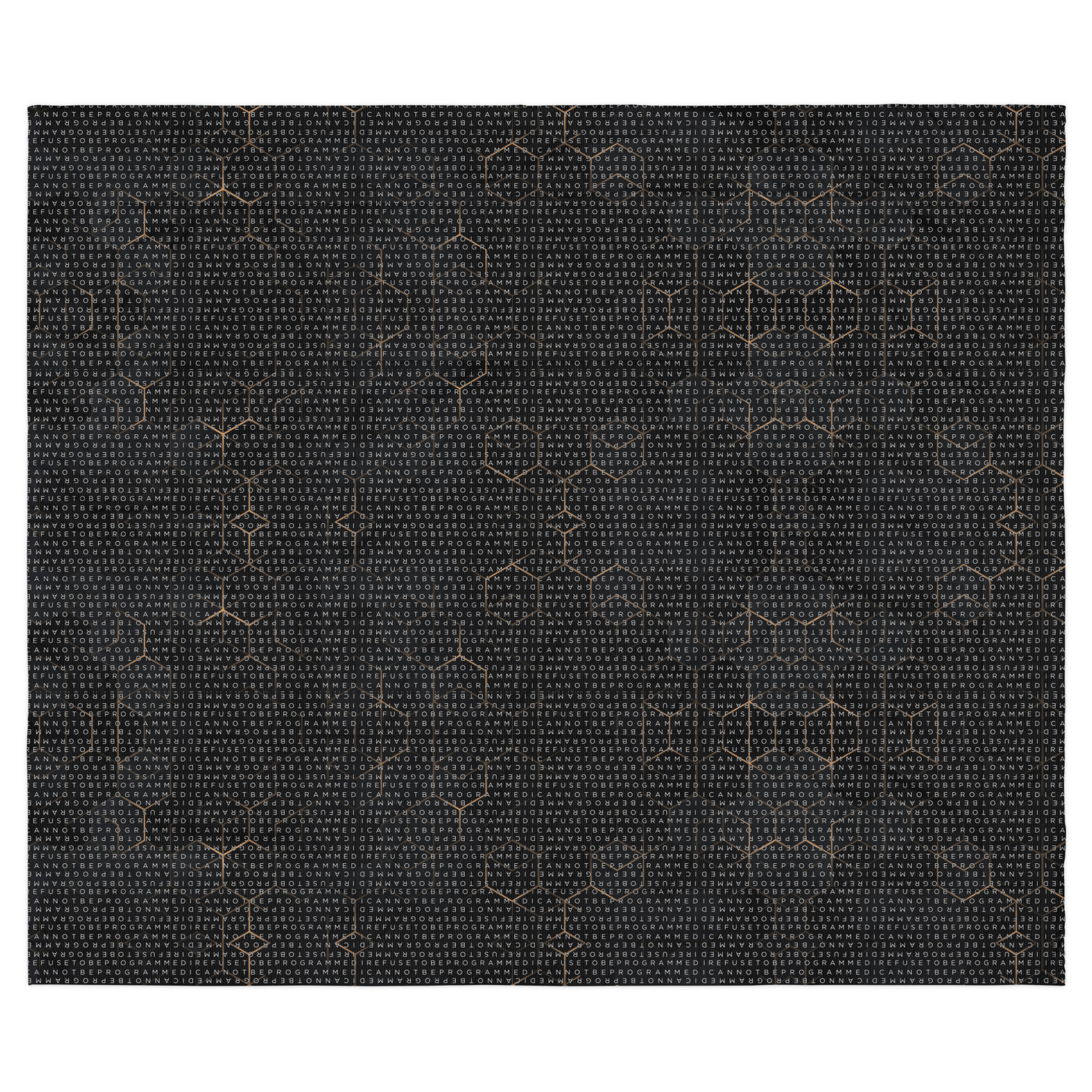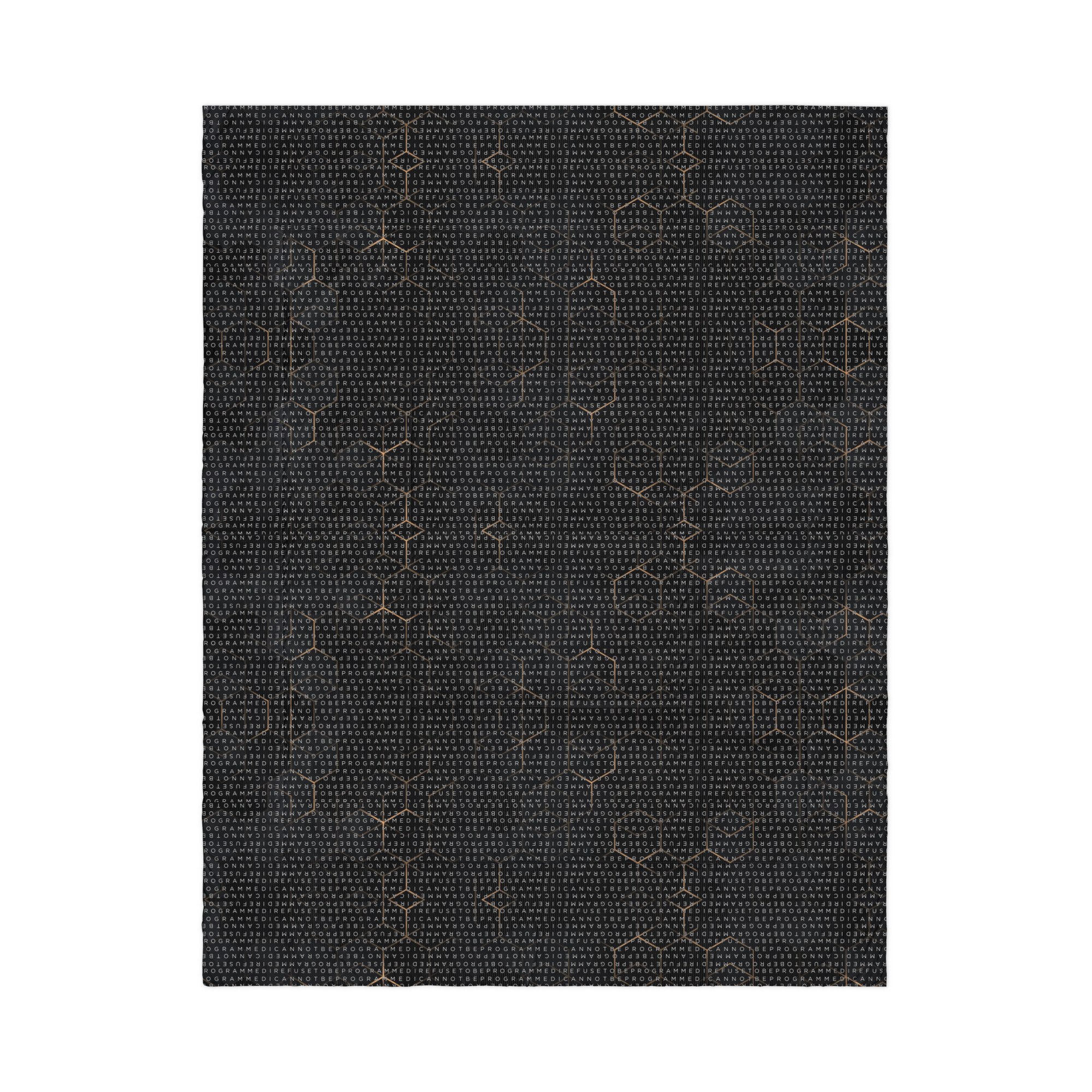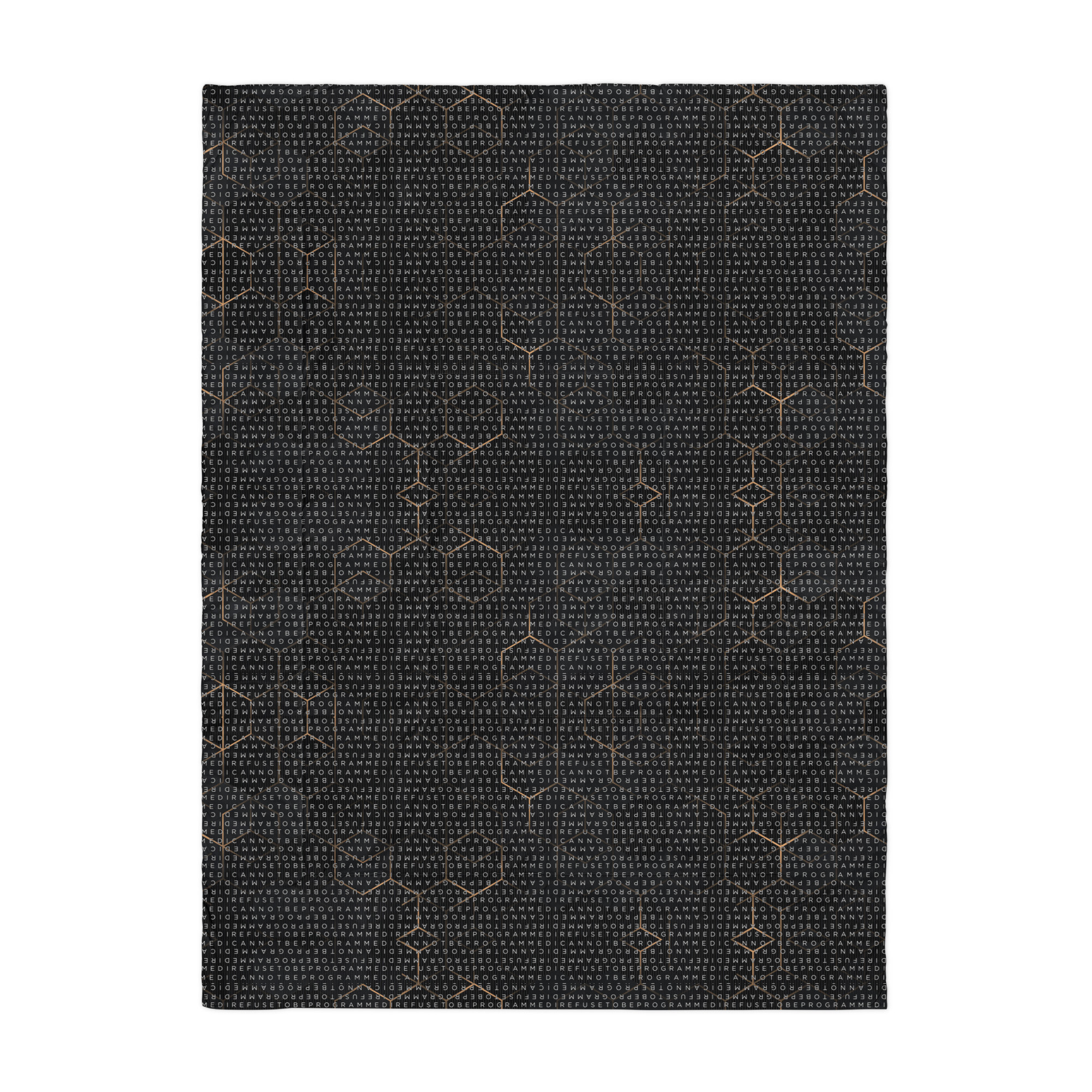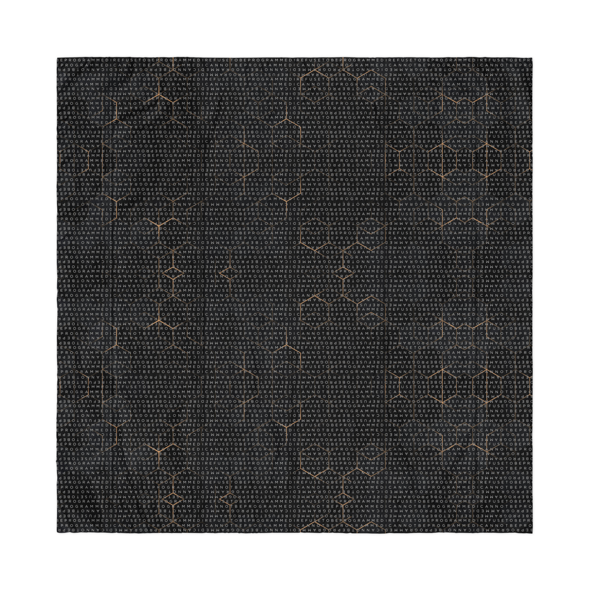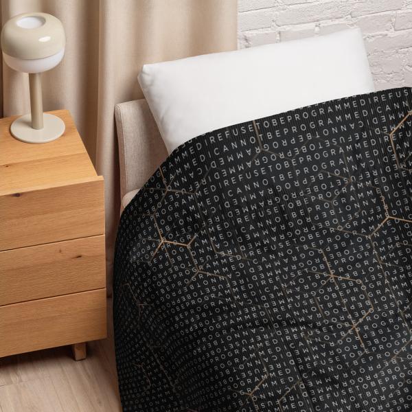 Bundle up and get cozy with this I Refuse to be Programmed white monogrammed lightweight comforter. The comforter features one side that is white and the designed side features the dark golden grid base pattern with the I Refuse to be Programmed/I Cannot be Programmed white monogram reverse jacquard cascading across.
