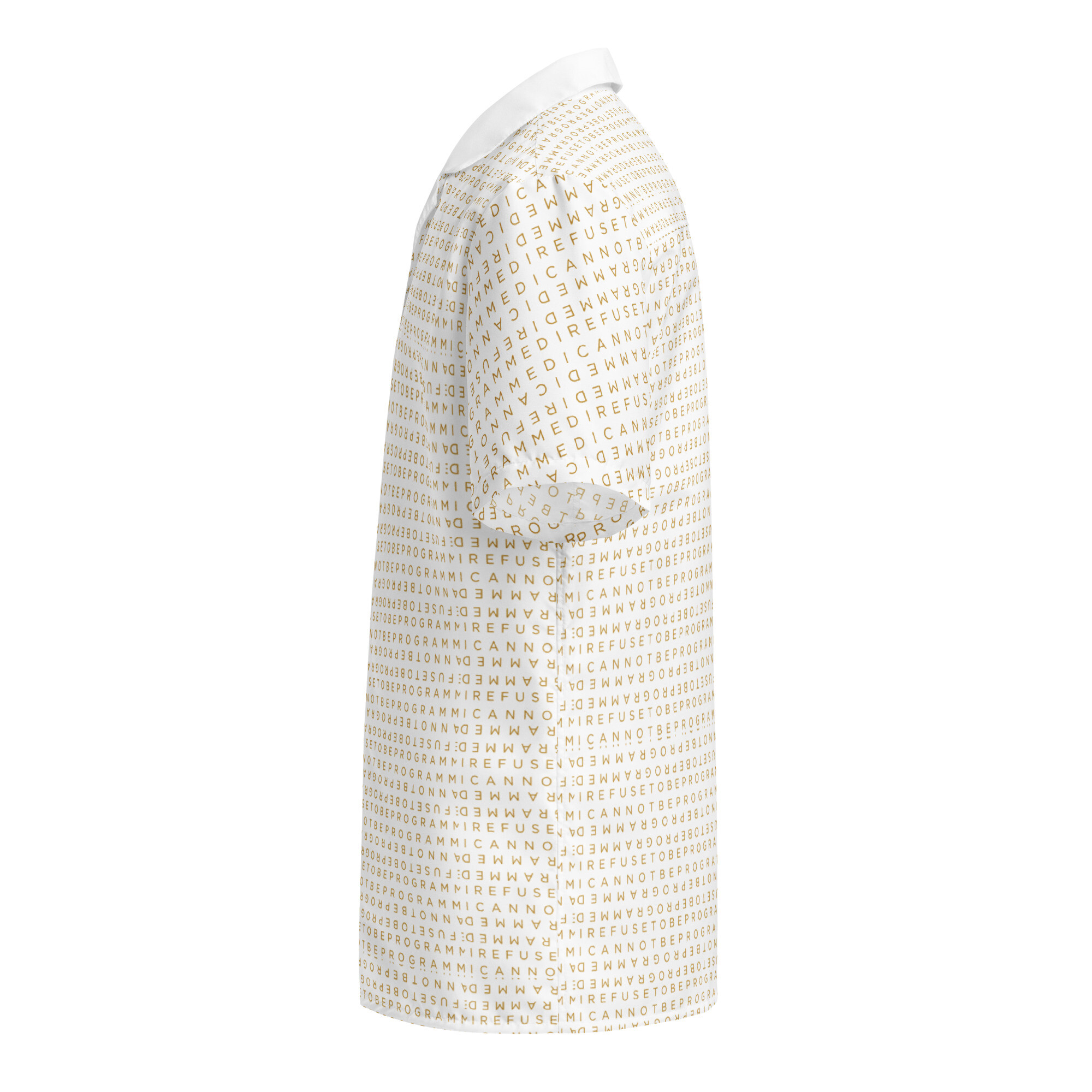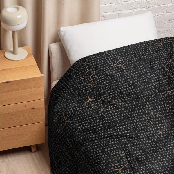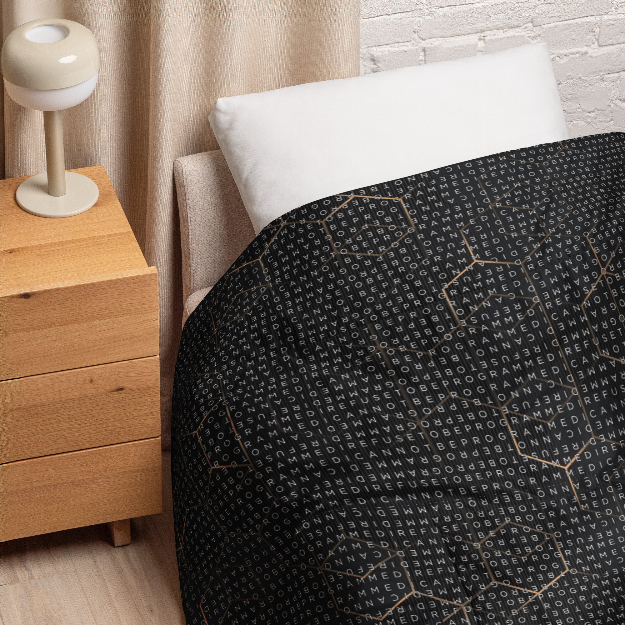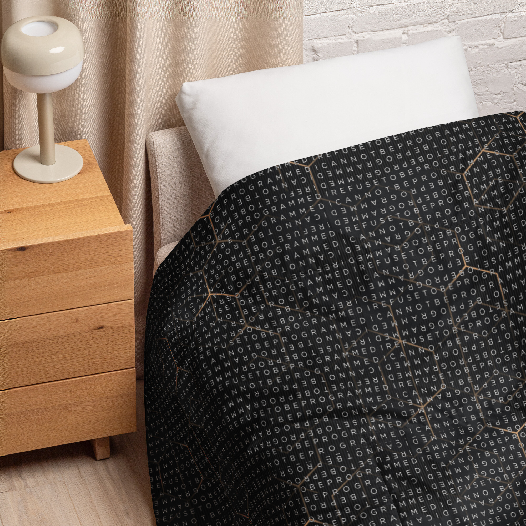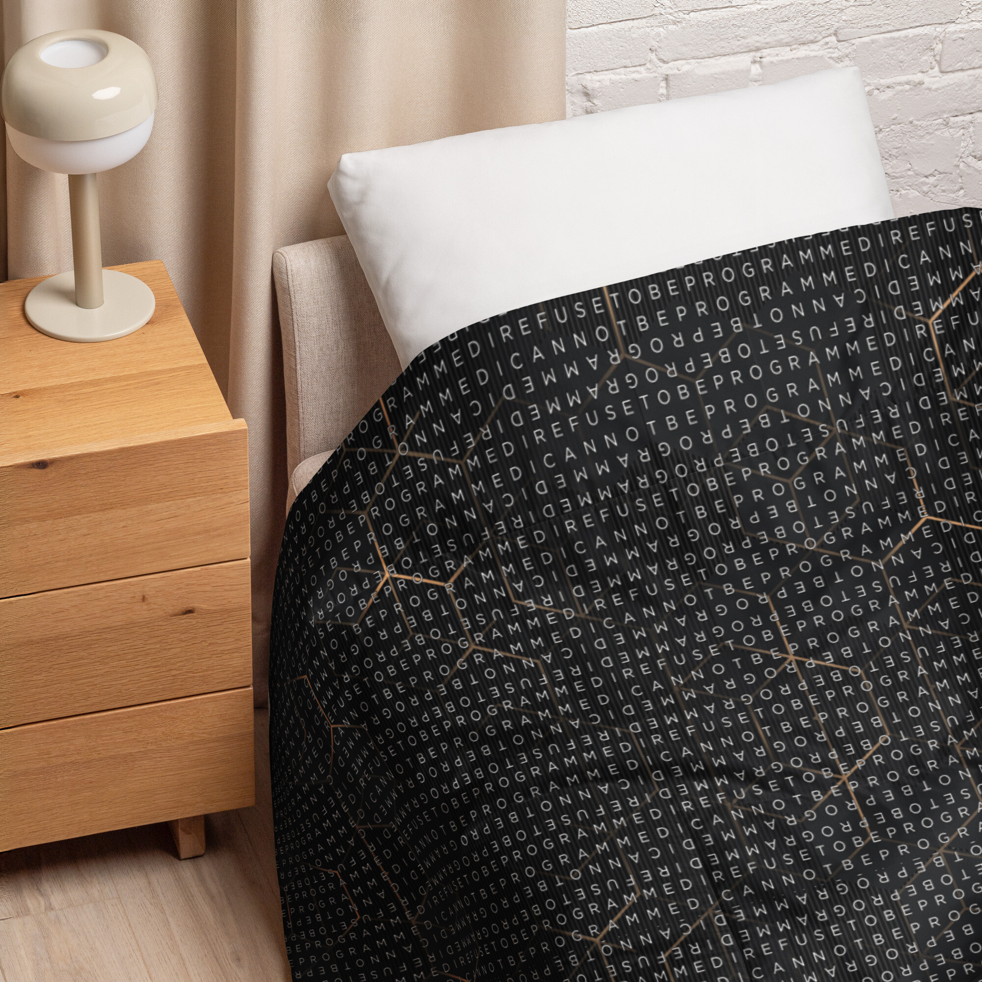 Bundle up and get cozy with this I Refuse to be Programmed white monogrammed lightweight comforter. The comforter features one side that is white and the designed side features the dark golden grid base pattern with the I Refuse to be Programmed/I Cannot be Programmed white monogram reverse jacquard cascading across.