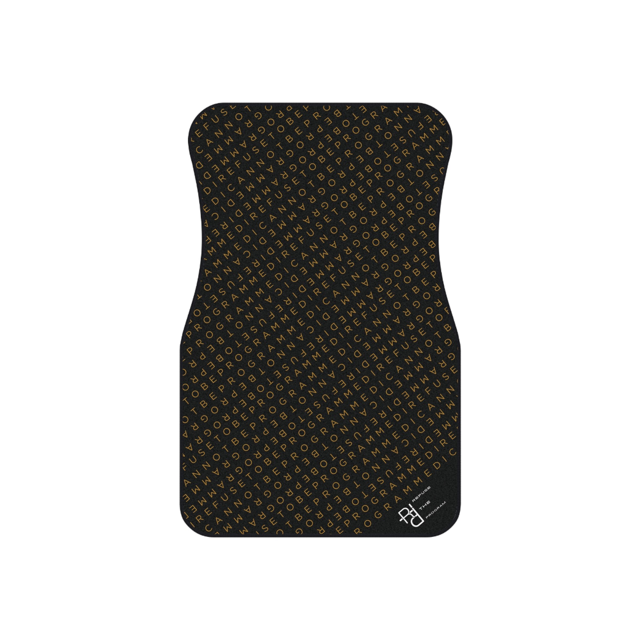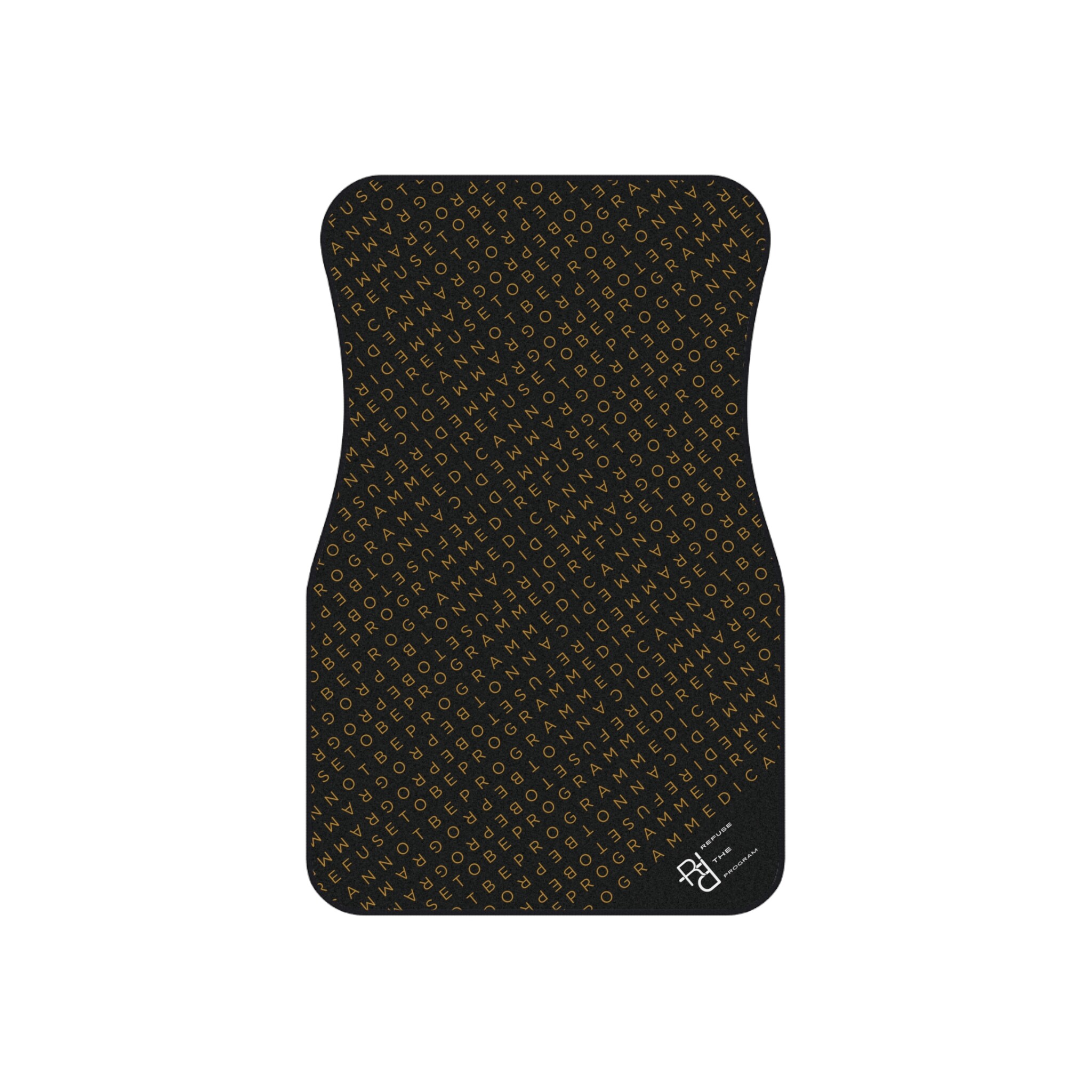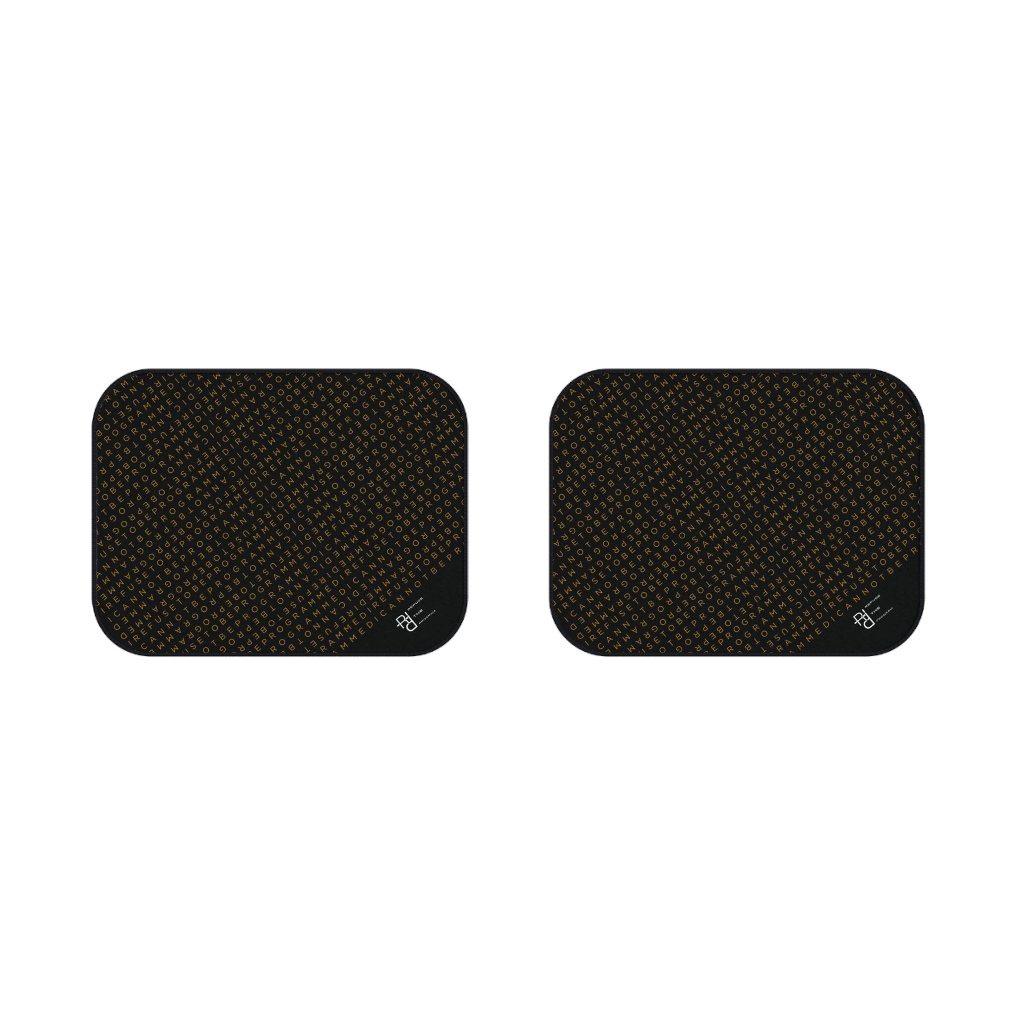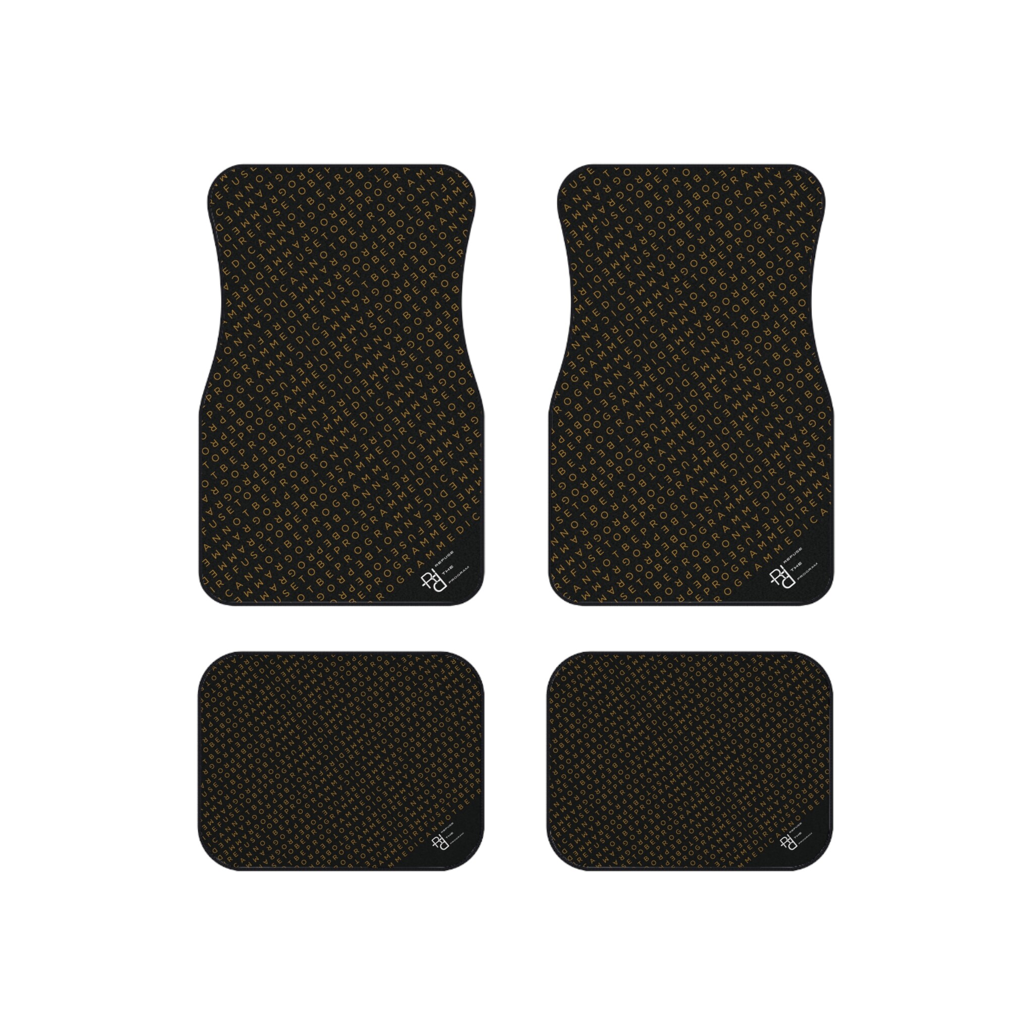 Get this full set of I Refuse to be Programmed car floor mats each featuring the IR2BP gold monogram cascaded diagonally with an RTP white logo at the bottom right corner. Each mat has a polyester needle-punch surface with non-slip rubber backing.