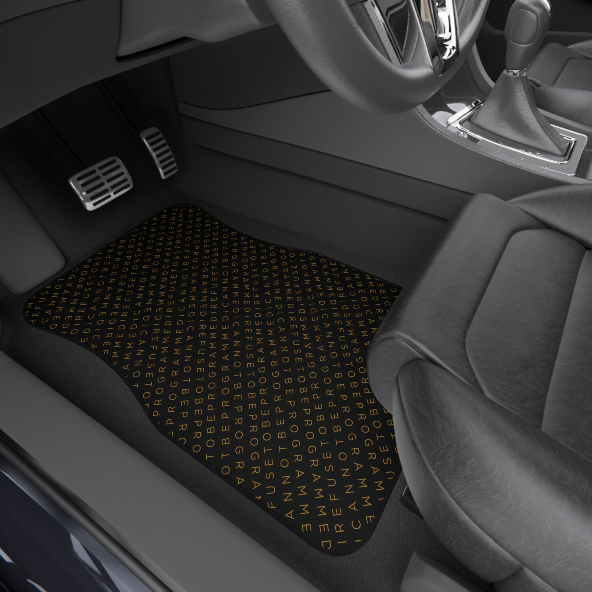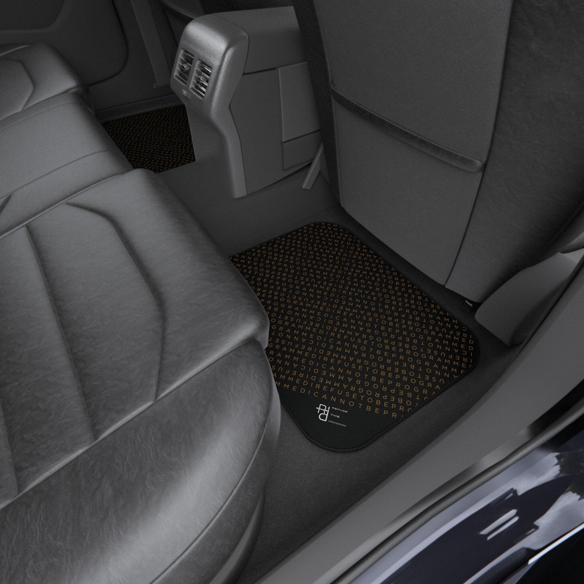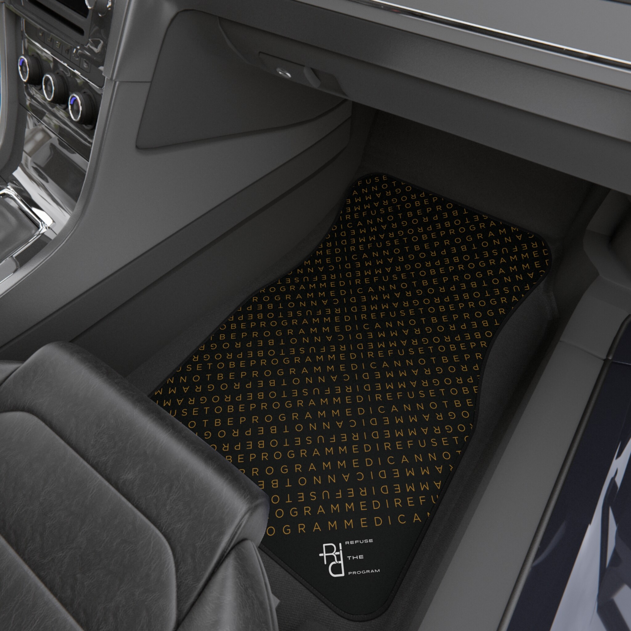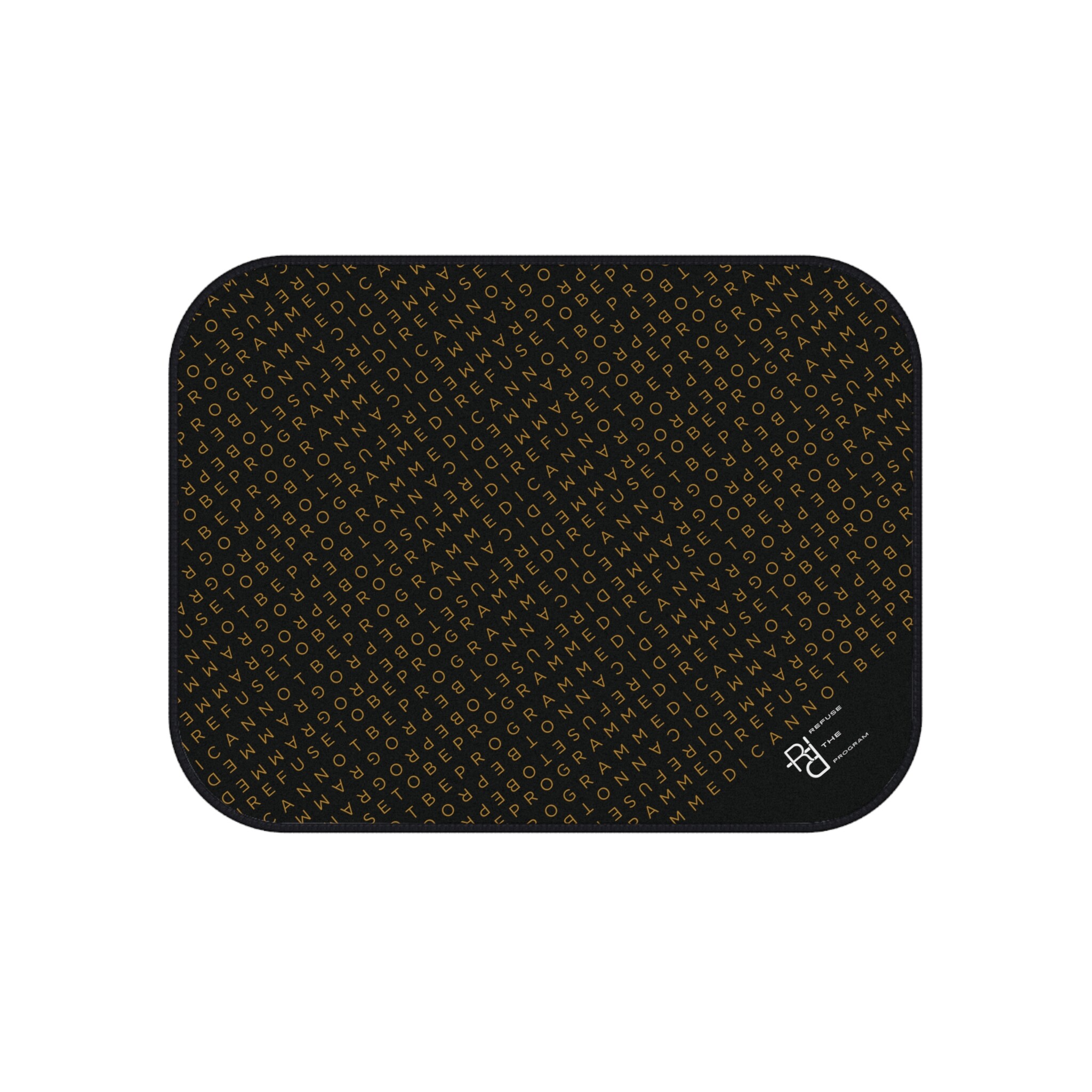 Get this full set of I Refuse to be Programmed car floor mats each featuring the IR2BP gold monogram cascaded diagonally with an RTP white logo at the bottom right corner. Each mat has a polyester needle-punch surface with non-slip rubber backing.