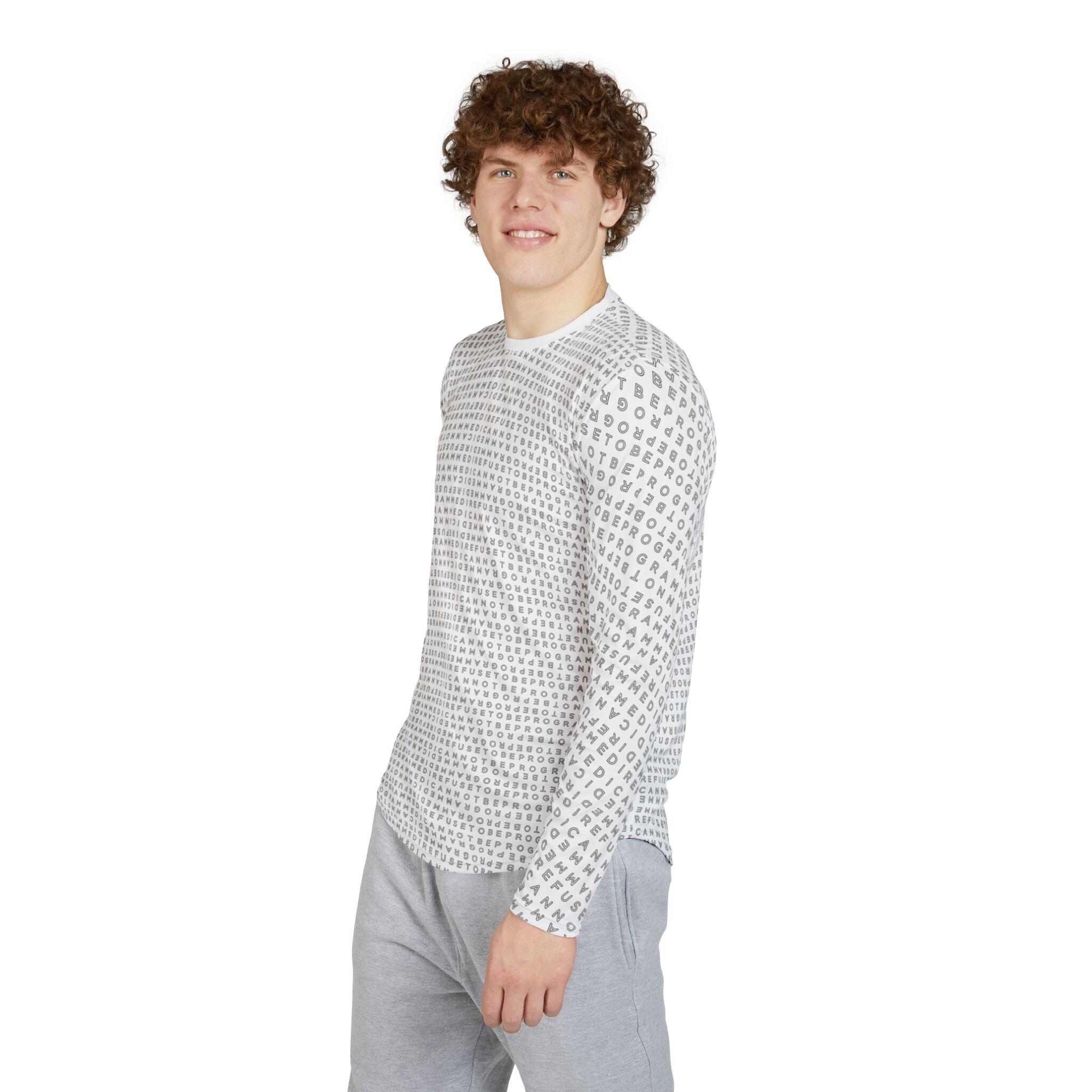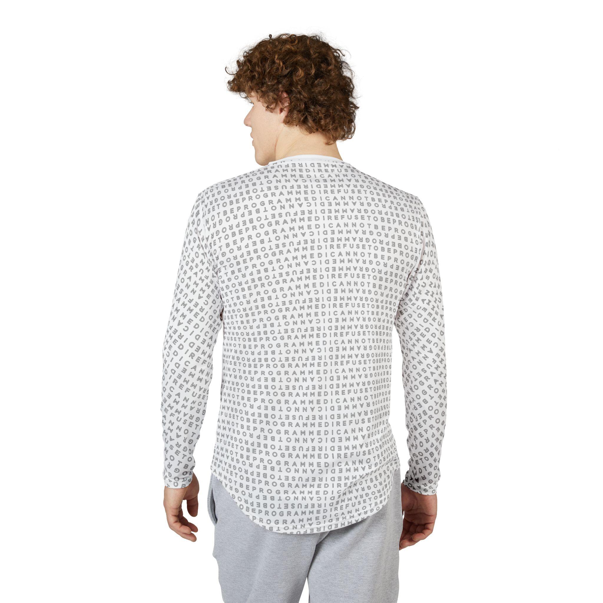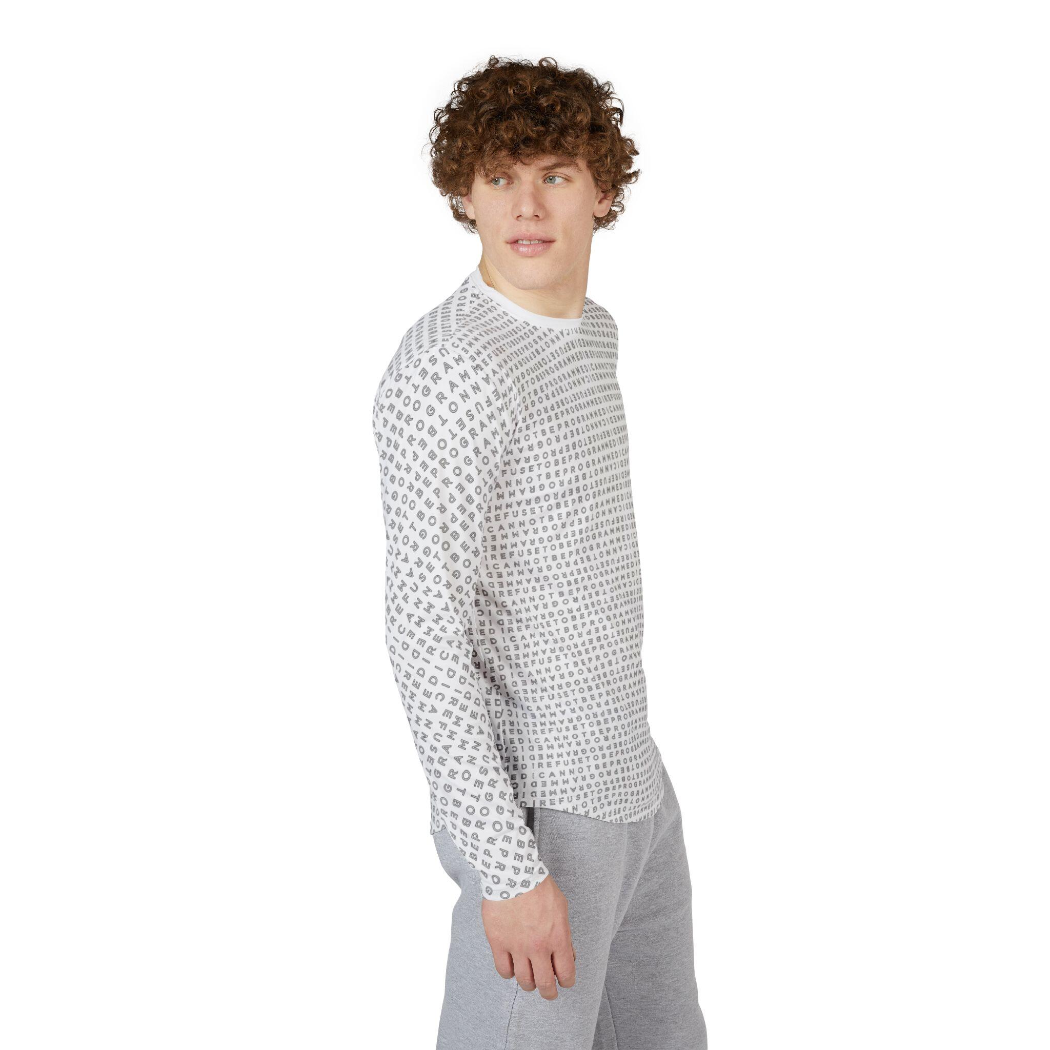 This Men’s I Refuse to be Programmed outline monogrammed long-sleeve shirt offers UV Protection, combines comfort and functionality and provides an athletic edge. Featuring a hemmed sleeve and shoulder tape for added durability, this shirt is ideal for outdoor activities or everyday wear, balancing style and performance in one sleek design.