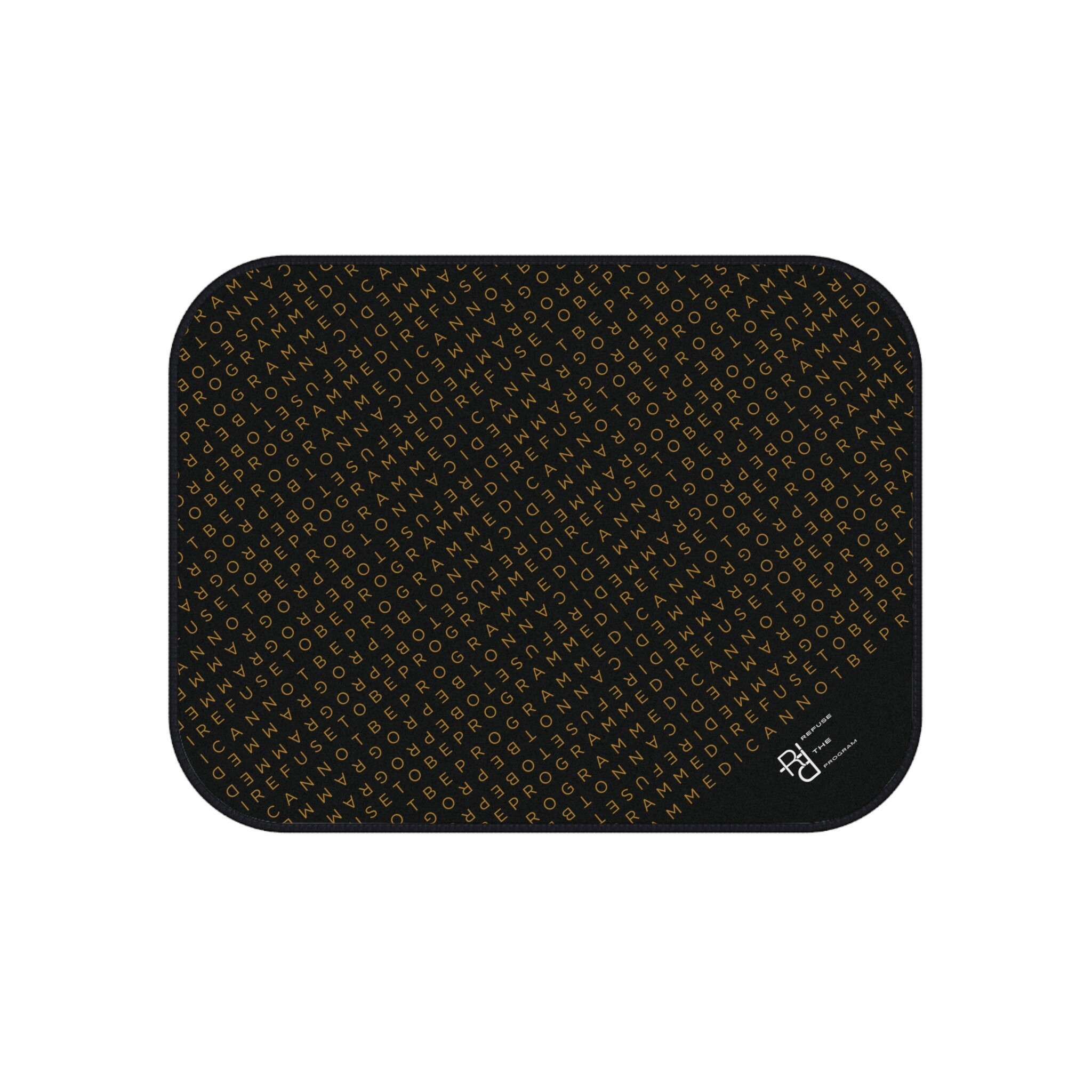 Get your pair of I Refuse to be Programmed rear car floor mats each featuring the IR2BP gold monogram cascaded diagonally with an RTP white logo at the bottom right corner. Each mat is 17″ x 13″ and has a polyester needle-punch surface with non-slip rubber backing.