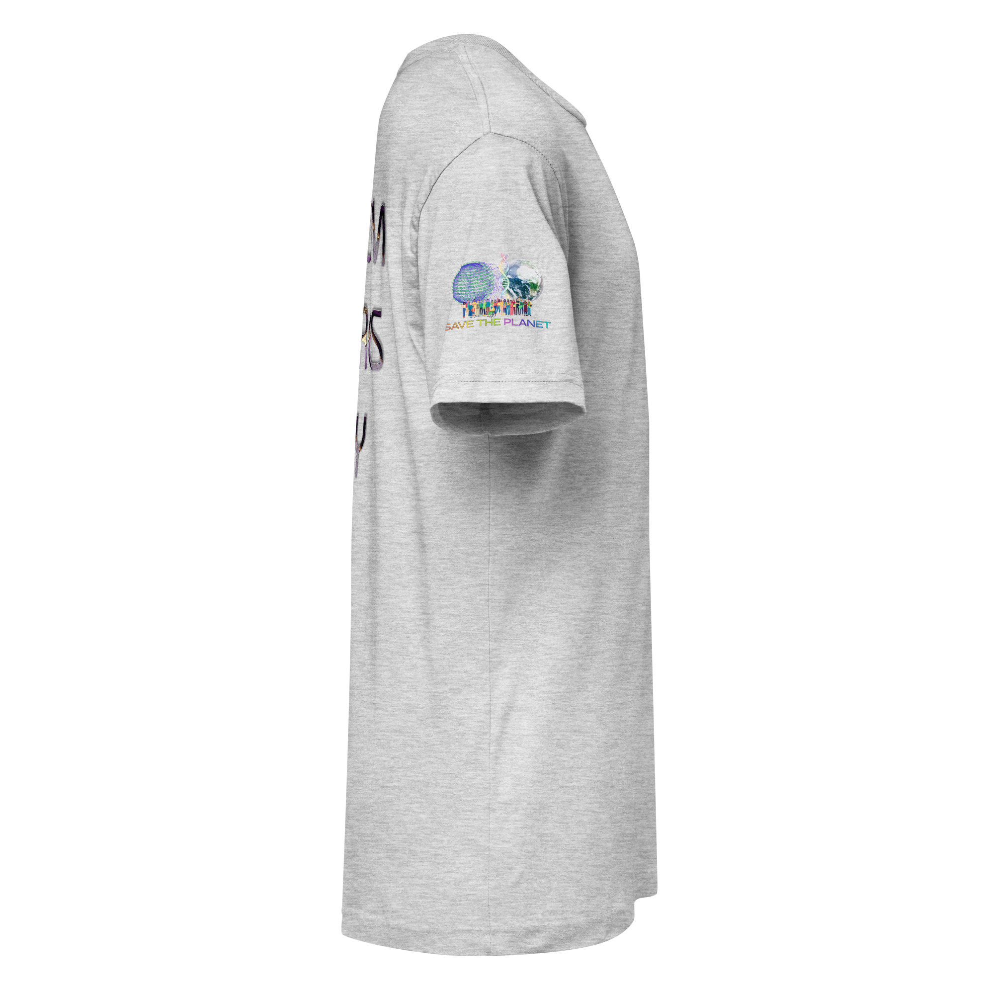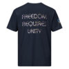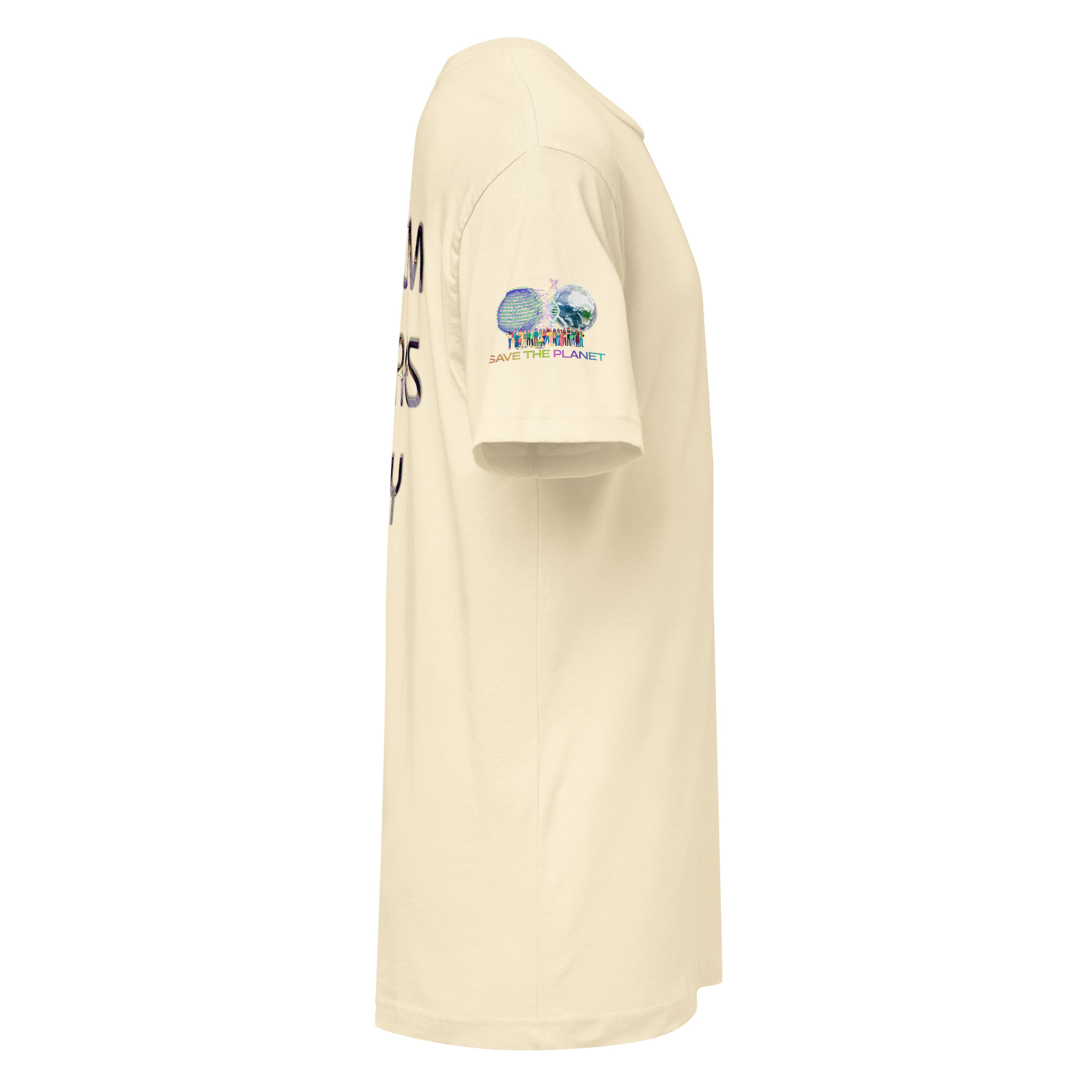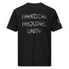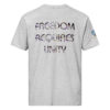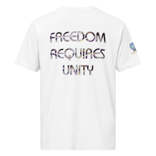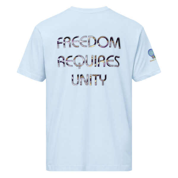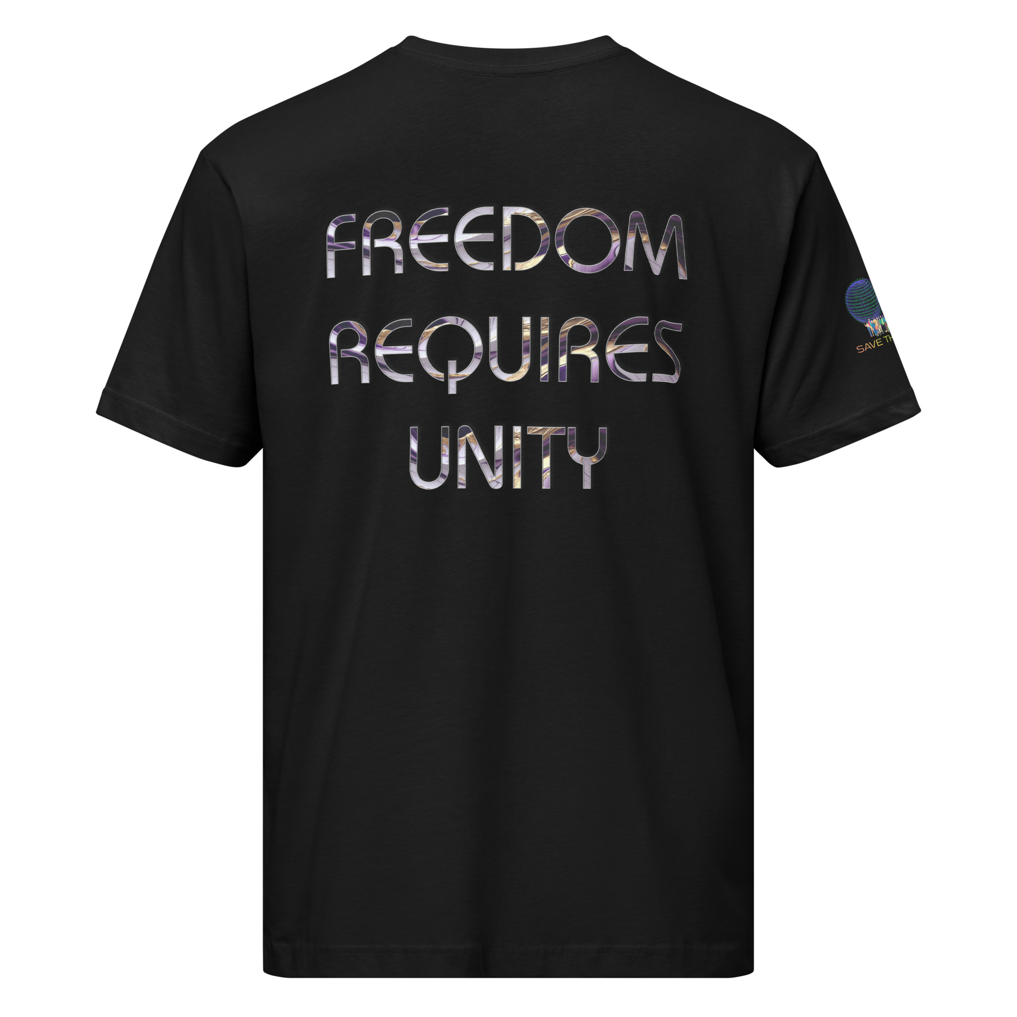 A stylish cotton shirt featuring the slogan “Freedom Requires Unity” printed in golden abstract purple on the back with a Save the Planet logo on the right sleeve. The shirt is available in various colors and is a good conversation starter.